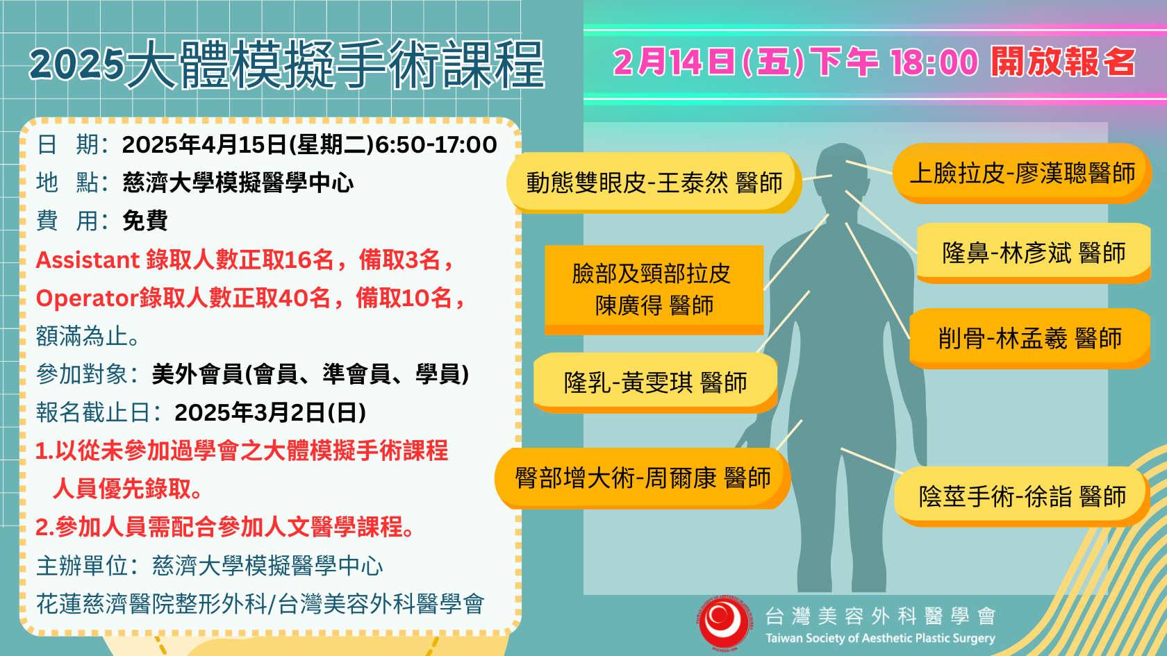 【課程預告】2025 台灣美容外科醫學會 大體模擬手術課程