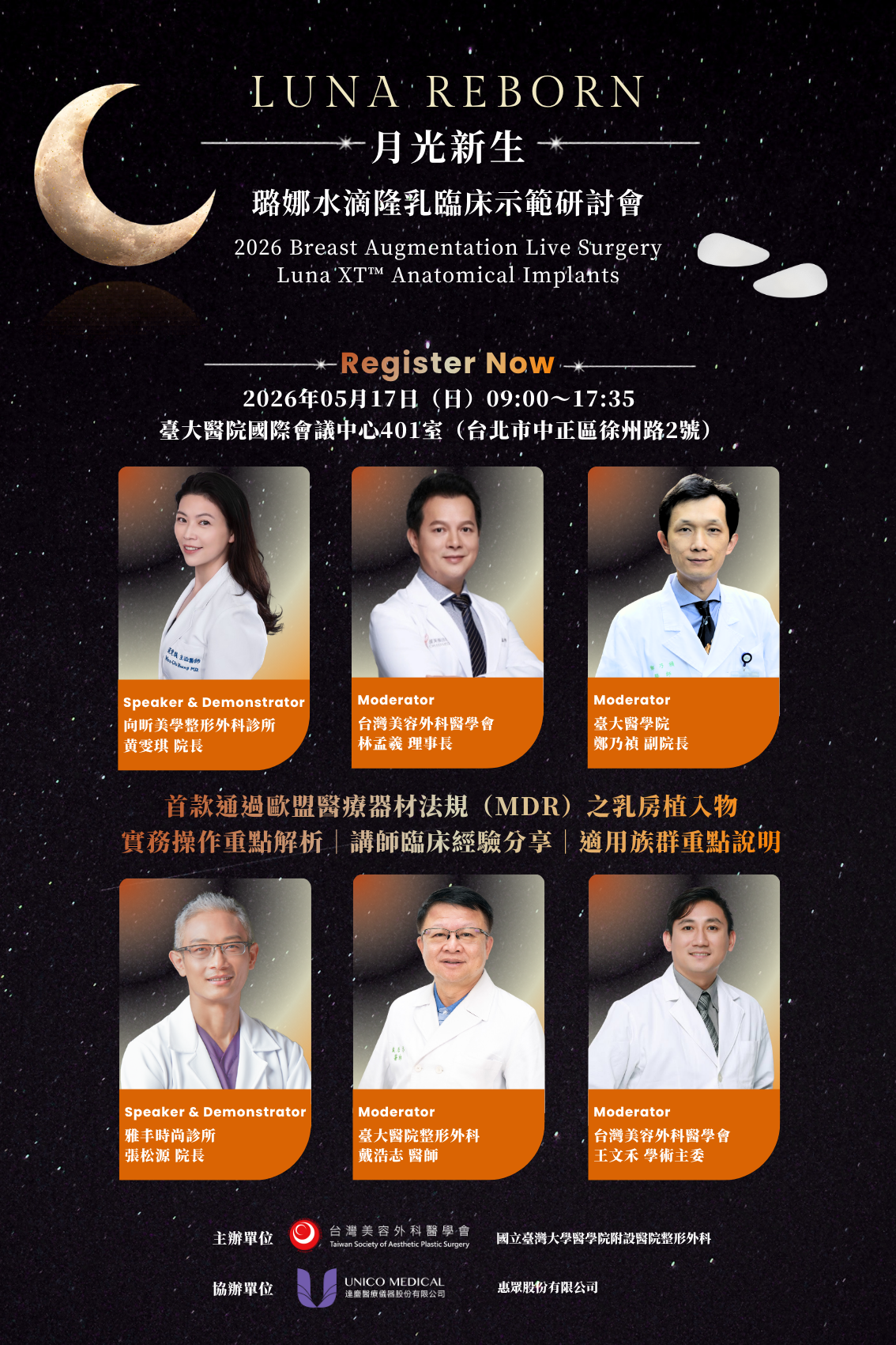 本次課程將採用達慶醫療儀器股份有限公司最新 Luna 假體進行隆乳手術示範,由張松源醫師與黃雯琪醫師執刀,親自示範完整手術流程,並帶領與會醫師掌握關鍵技術與臨床要點。